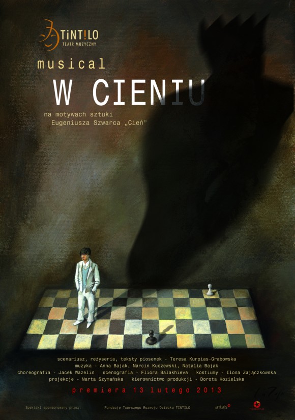 Musical „W cieniu” jest kolejną dużą produkcją Teatru Muzycznego Tintilo. Na deskach Teatru Rampa, bo tam będzie grany w dniach 28-29 maja wystąpią adepci szkoły musicalowej Tintilo i zawodowi aktorzy. Będzie można zobaczyć Olgę Kalicką znaną z serialu Rodzinka.pl, ale także sporą grupę uczestników popularnego programu Bitwa na Głosy: Kamil Krupicz w roli Cienia czy Sylwia Przetak w roli Księżniczki.